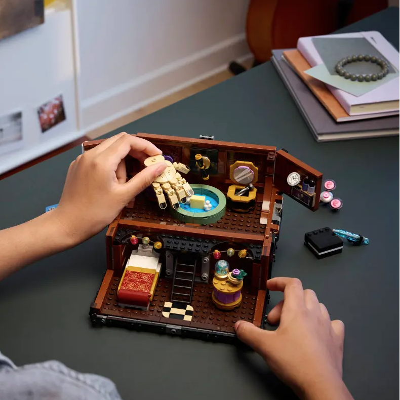 Un gioco infinito con una casa portatile attende i fan di Mercoledì dai 10 anni in su con questo dettagliato set da costruzione in mattoncini Appartamento di Mano di Mercoledì LEGO® (76785). Un divertente regalo di compleanno per i bambini, questo modello creativo play-and-display contiene un baule apribile che include un letto, una sedia, un cappello e un orologio, uno spazio nella parte superiore del baule per adesivi, smalto, crema per le mani e altro ancora. Più una figura snodabile di Mano e una minidoll di Enid.