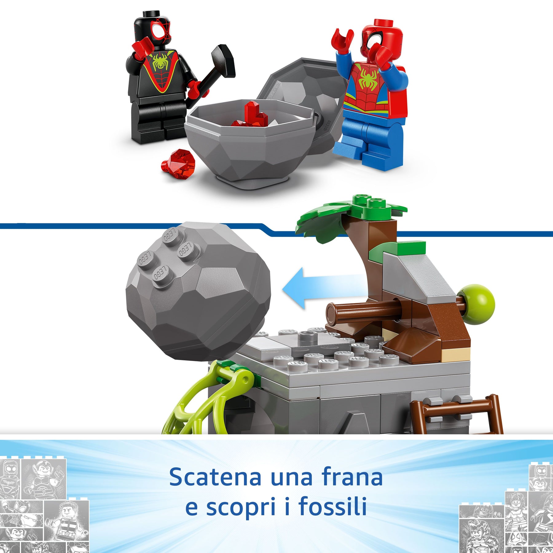 Miles “Spin” Morales è alla ricerca di fossili mentre il Ghostosaurus irrompe nella grotta per trovare l’uovo di dinosauro nascosto. Attenzione alla grande roccia che potrebbe cadere! Dino-Rhino arriva nella grotta per rovinare il divertimento, ma gli eroi lo bloccano lanciando una dino-web. Spidey arriva sulla sua dino-ruspa con lancia-ragnatele per rimuovere definitivamente Dino-Rhino.Regala ai fan di Spidey e i suoi fantastici amici il set Team Spidey: salvataggio su dino-ruspa (11199), contenente dinosauri build-and-play creati per i bambini dai 4 anni in su. Questo giocattolo con dinosauri costruibili contiene supereroi, dinosauri e accessori divertenti per ispirare il gioco di ruolo di fantasia dei bambini e delle bambine, aumentando la loro sicurezza di sé e le loro capacità di risoluzione dei problemi. Questo set di gioco LEGO® costruibile include le minifigure di Spider-Man e Miles “Spin” Morales e 2 dinosauri costruibili: Ghost-Spider come pterodattilo e Rhino come triceratopo. C’è anche la dino-ruspa LEGO di Spider-Man con una grande rete sul retro, una funzione di caduta massi azionata tramite grilletto, un uovo di dinosauro da rivelare e una rete che può essere abbassata per intrappolare il cattivo. Sono presenti anche istruzioni intuitive sotto forma di una colorata guida con storie illustrate e buste separate che contengono mattoncini e un grande Starter Brick per una costruzione facile e veloce. I set LEGO per i bambini dai 4 anni in su, gli adulti potranno condividere il divertimento costruttivo con i più piccoli.