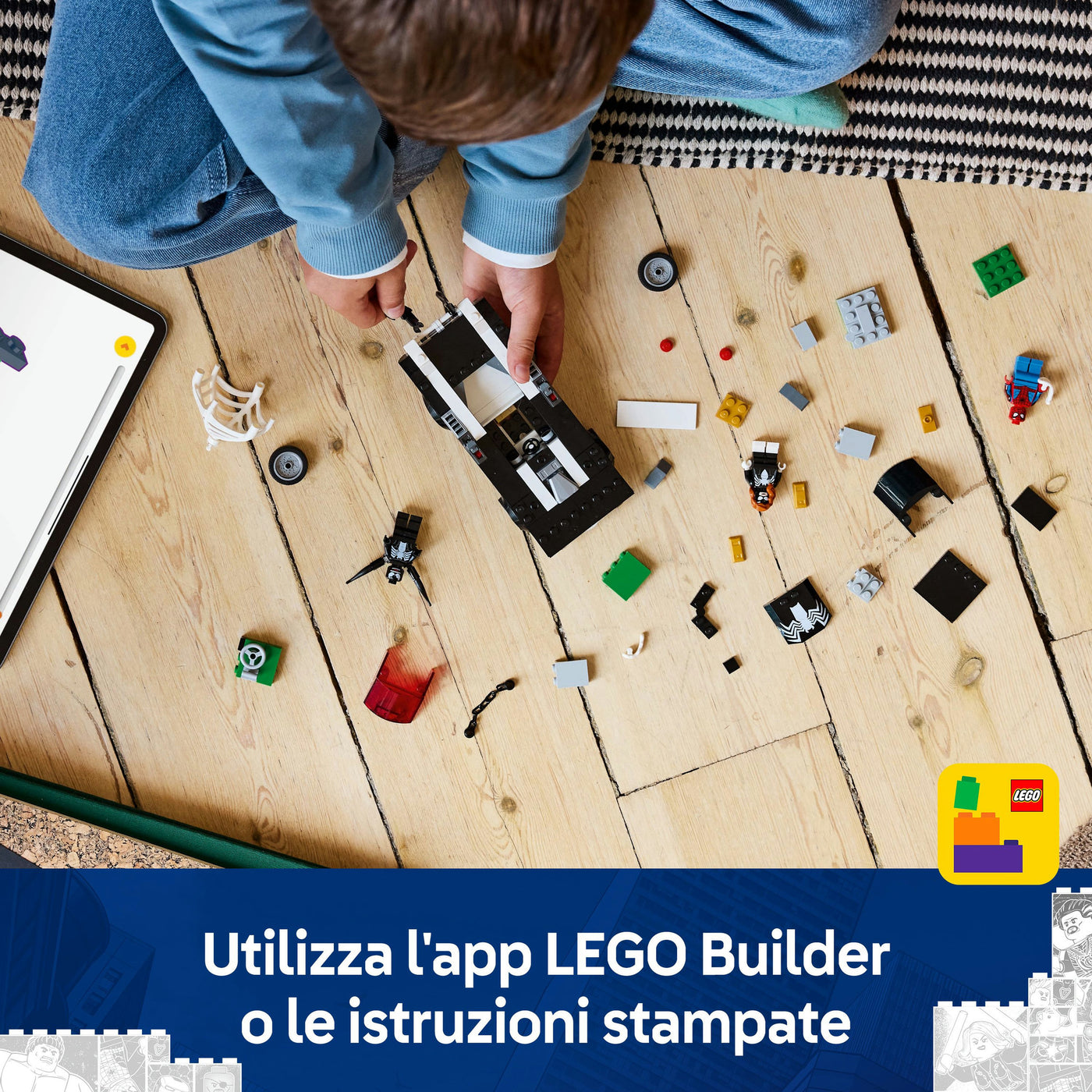 Quando Spider-Man scopre Venom intento a rubare lingotti d’oro dalla cassaforte, il cattivo scappa a bordo della sua muscle car venomizzata, trascinandosi dietro la cassaforte! Spider-Man entra in azione, con lo spara-ragnatele, mentre Spider-Woman lancia una gigantesca ragnatela su Venom, che reagisce con il suo spara-ragnatele. Riuscirà Venom a scappare con i lingotti d’oro?Spider-Man contro Muscle Car di Venom (76309) è un playset con macchinina costruibile di alta qualità per i bambini e le bambine dai 7 anni in su. Questo set LEGO® build-and-play è un regalo ideale per i giovani supereroi, in particolare per i fan di Marvel e per i bambini che amano i giocattoli avventurosi. L’auto giocattolo costruibile di Venom presenta 3 minifigure: Spider-Man con un blaster spara-ragnatele, Venom con 4 tentacoli e Spider-Woman (Julia Carpenter) con una ragnatela flessibile abbastanza grande da intrappolare un cattivo. L’auto venomizzata è dotata di shooter su ciascun lato, motore accessibile e cabina di guida apribile. Venom può sedersi all’interno dell’auto rimuovendo i suoi 2 tentacoli inferiori, che possono essere utilizzati per venomizzare ulteriormente l’auto. Una cassaforte contenente lingotti d’oro ispira il gioco di ruolo tra gli eroi e il cattivo. La cassaforte può essere trascinata via con l’auto, la quale contiene anche un vano per i lingotti d’oro. Per tanto divertimento digitale in più, i costruttori possono ingrandire, ruotare i modelli in 3D e monitorare i loro progressi utilizzando la divertente e intuitiva app LEGO Builder.